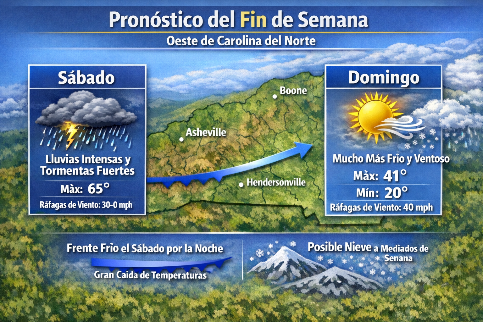 Después de un periodo de lluvias intensas, vientos fuertes y temperaturas inusualmente cálidas, regresarán las condiciones invernales al oeste de Carolina del Norte este fin de semana, según el Servicio Meteorológico Nacional. Se esperan lluvias hasta el sábado en toda la región, con la posibilidad de aguaceros fuertes en algunos momentos. Aunque no se anticipan […]